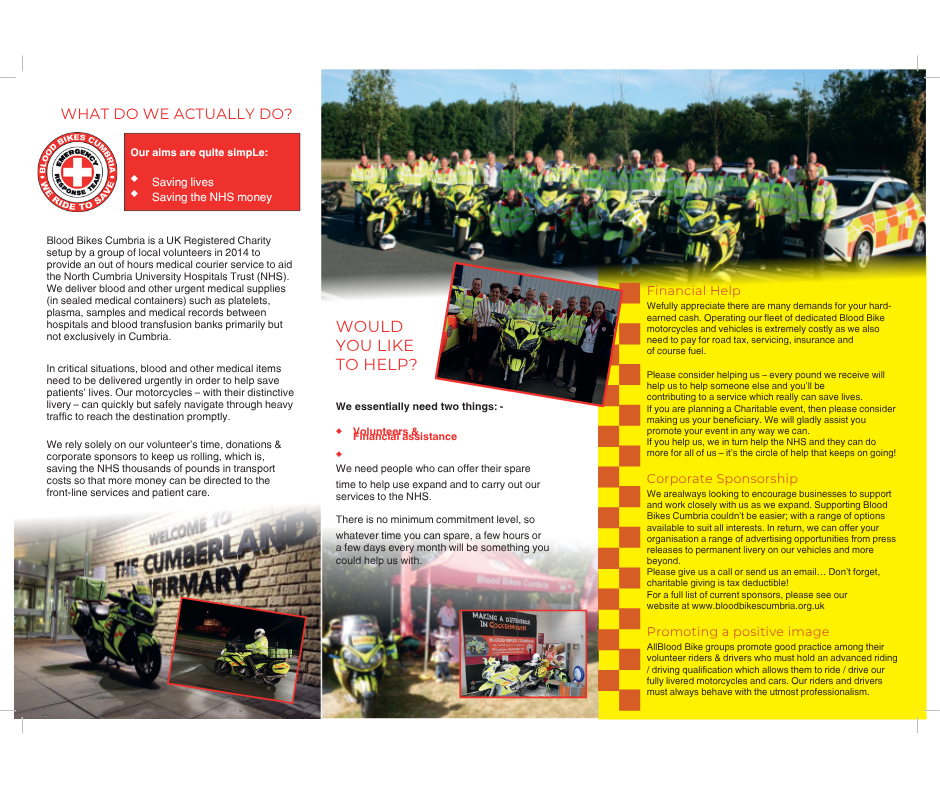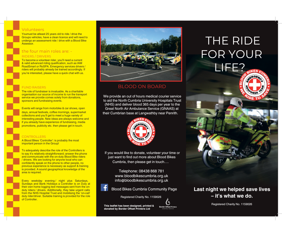 Blood Bikes Cumbria Other news 7 November 20257 November 2025 Blood Bikes Cumbria: Riding to Save Lives, Powered by Local Support Category: Charity Spotlight | Region: North West Blood Bikes Cumbria is a registered charity run entirely by volunteers, providing a free, out-of-hours emergency transport service for the North Cumbria Integrated Care NHS Foundation Trust and the Great North Air Ambulance Service. Their fleet of motorcycles and cars deliver blood, plasma, breast milk and urgent medical supplies across the region—365 days a year. This vital service is funded solely through public donations and community-led fundraising. From supermarket collections to bike shows and charity walks, every pound raised helps keep their bikes on the road and their mission alive. How You Can Help Whether you’re a rider, fundraiser, or simply passionate about supporting your local NHS, there are many ways to get involved: • Donate: Every contribution helps cover fuel, maintenance and operational costs. • Fundraise: Organise or join events in your area—bike meets, charity rides or local shows. • Volunteer: From riders to coordinators, Blood Bikes Cumbria welcomes new members across the region. As part of our ongoing support for motorcycle-led charities, the British Motorcyclists Federation encourages members and supporters in Cumbria to explore how they can contribute to this life-saving initiative. 🔗 Learn more or get involved at Blood Bikes Cumbria website 📄 Read the “Ride for Your Life?” leaflet to explore volunteer roles and donation options: Written by MJ All images courtesy of Blood Bikes Cumbria Share on Facebook Share Share on TwitterTweet Share on Pinterest Share Share on LinkedIn Share Share on Digg Share